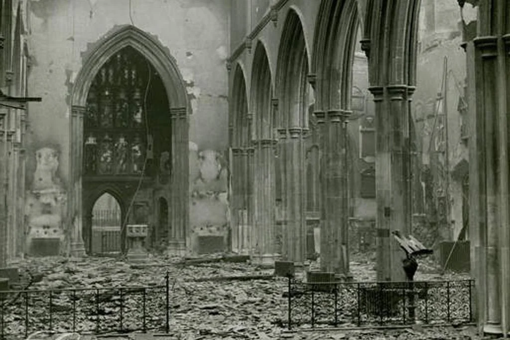 In the Second World War, the church was not so fortunate. It was the first City church to be a casualty. On 24th August 1940, during a daylight air- raid, a bomb exploded in what was then Fore Street near the north door of the church. However, the damage was not too severe, and it was hoped to complete repairs and re-open the church for Divine Service on New Year's Day 1941.