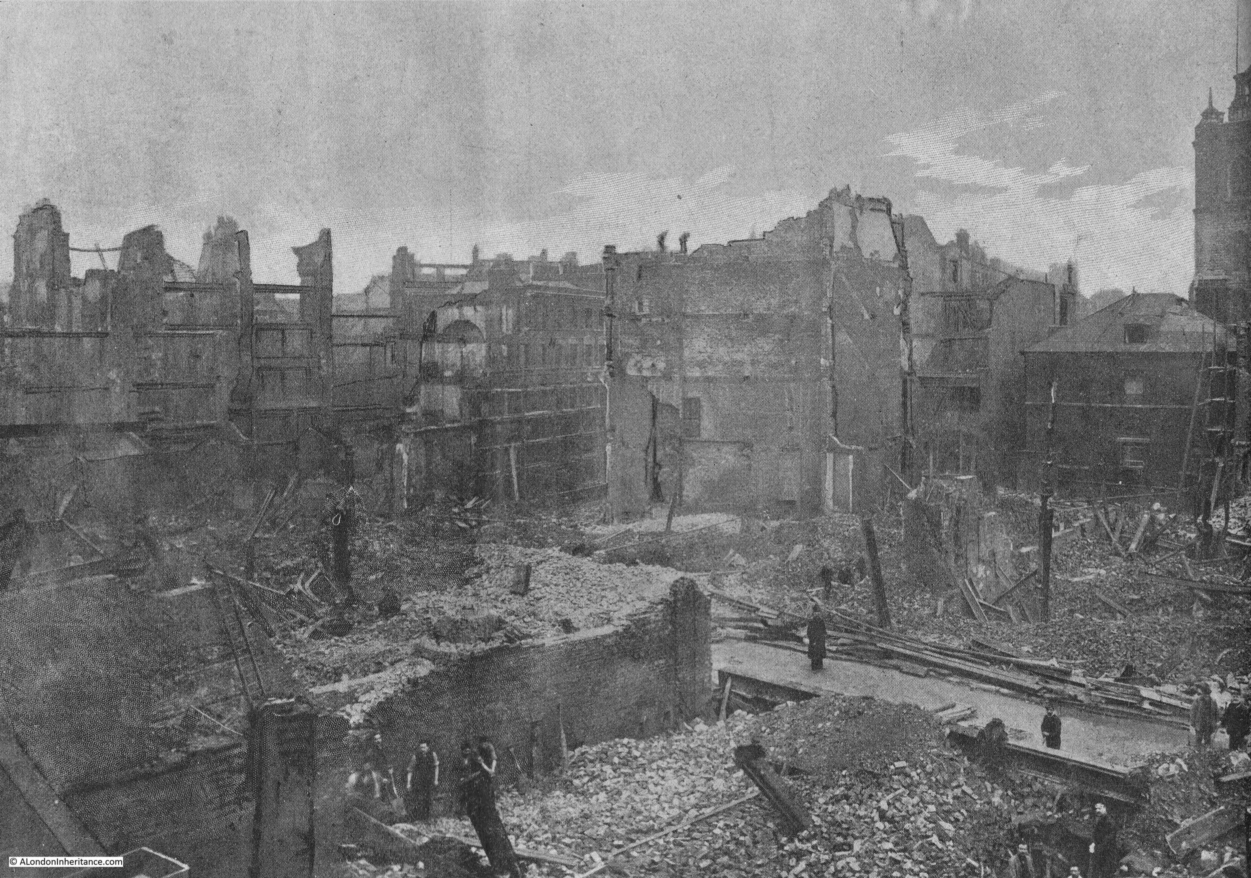 Unhappily, this was not to be as the church was straddled by incendiary bombs in the Great Fire Raid on the night of December 29th 1940 and completely burnt out. Only the blackened walls and the ruined tower remained. The heat of the fire had been so intense that the stone pillars were calcined. Most of the monuments were destroyed, but fortunately the church registers dating from 1561, the Churchwardens' Account Books from 1648, and the Vestry Minute Book dating from 1659 were rescued and may be inspected at the Guildhall Library.